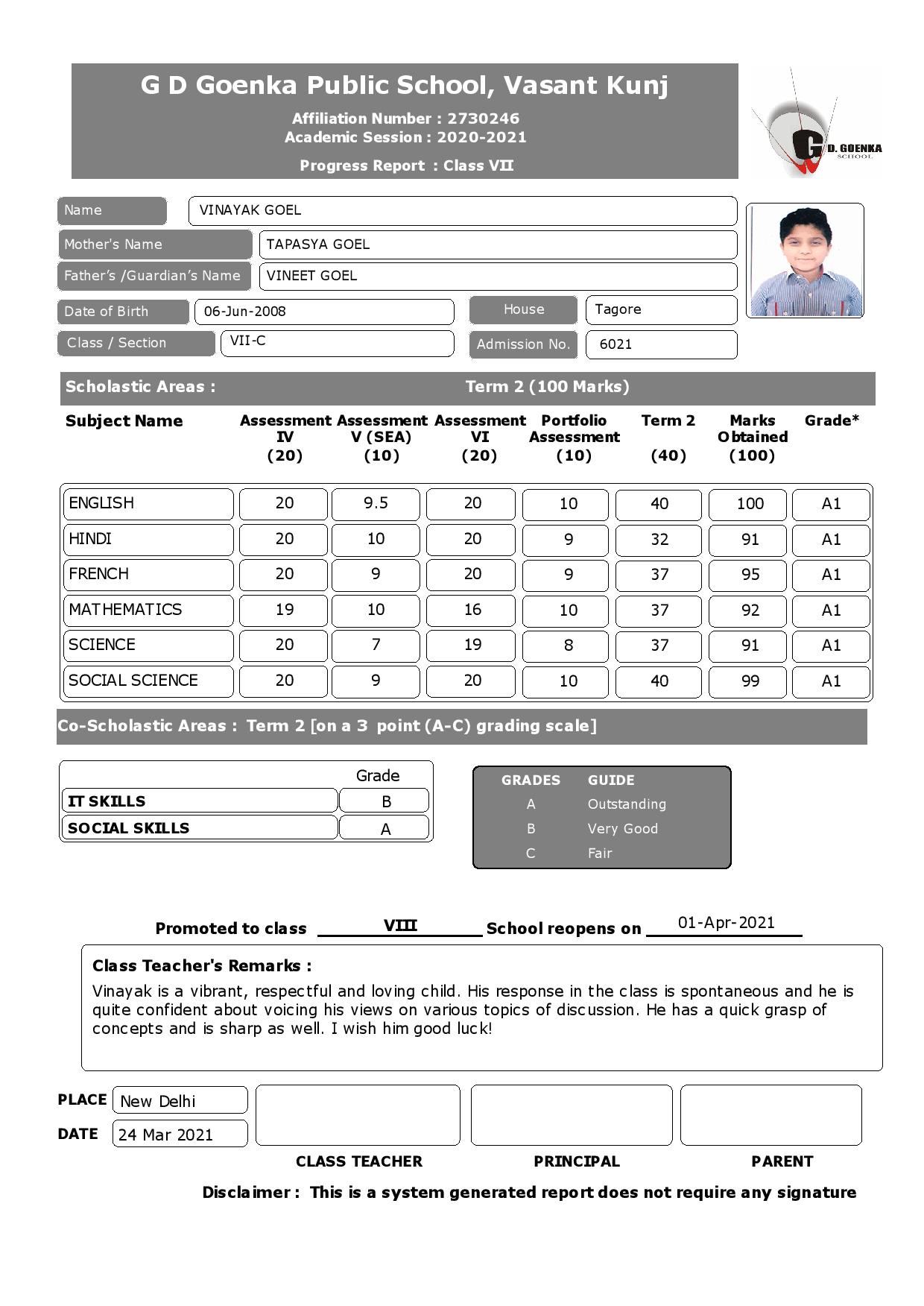 G D Goenka Public School Progress Report( 7th C )